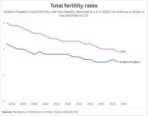 - Andhra Pradesh’s Total Fertility Rate (TFR) has declined significantly from 2.2 in 2003 (for undivided Andhra Pradesh) to 1.5 in 2023, well below the replacement level of 2.1.