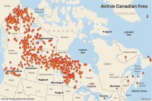 - Regional impact: ○ 21 major fires in Atlantic Canada. ○ Severe blazes in Manitoba, Saskatchewan, and other eastern provinces, including notable Quebec wildfires.