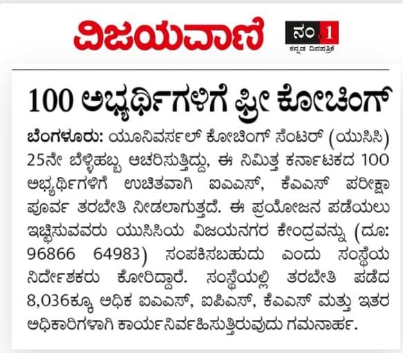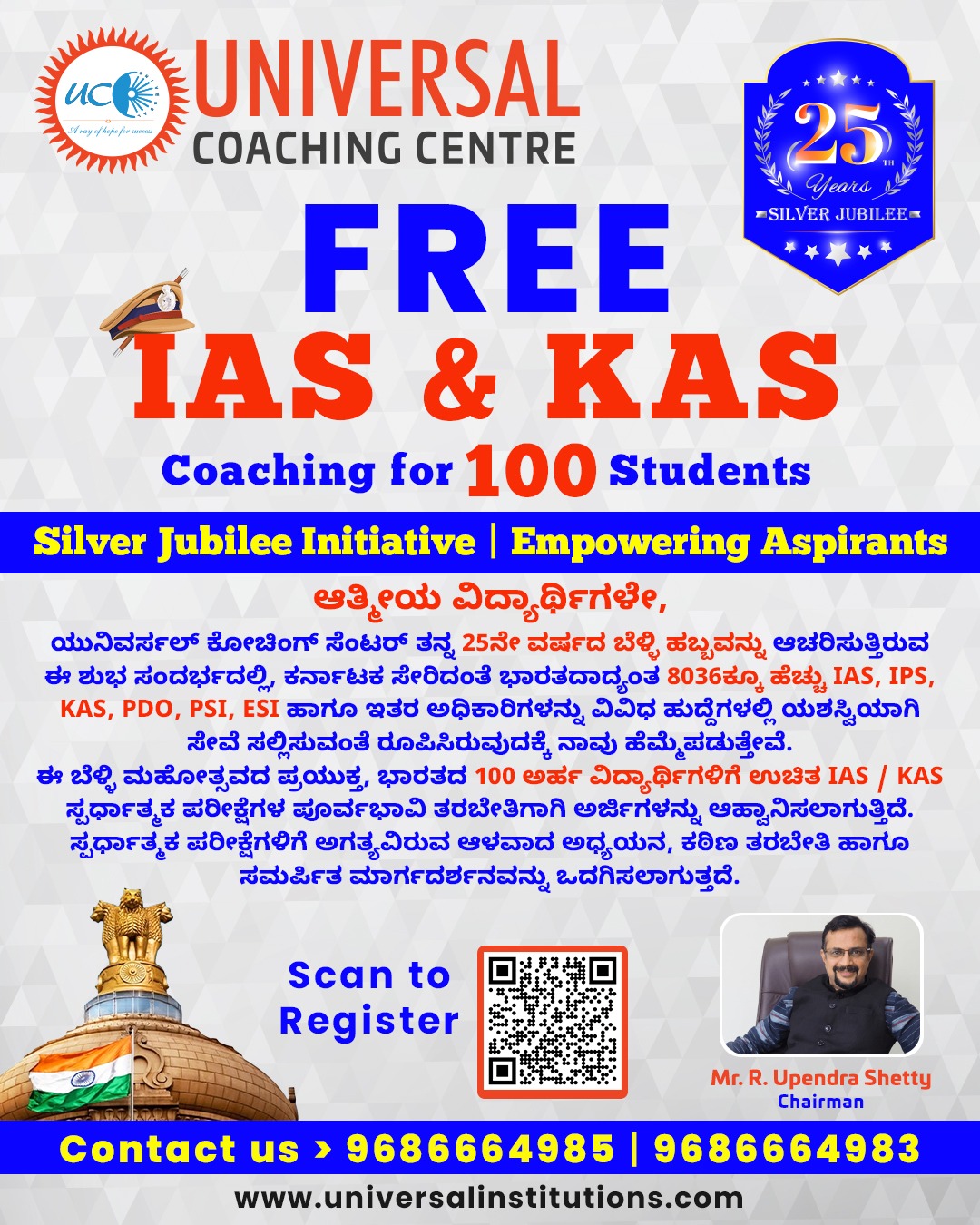 Universal Coaching Centre (UCC) is offering free IAS,KAS coaching to 100 meritorious students in celebration of its Silver Jubilee in 2026. This is a unique opportunity for aspirants to receive high-quality, exam-focused coaching that can significantly enhance their chances of success in the UPSC Civil Services Exam.