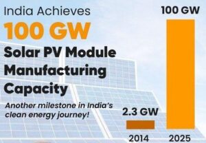 India has achieved a historic milestone of 100 GW solar PV module manufacturing capacity under the Approved List of Models and Manufacturers (ALMM). This reflects rapid growth from just 2.3 GW in 2014, strengthening India’s path toward Atmanirbhar Bharat and 500 GW renewable energy capacity by 2030, including solar, wind, and green hydrogen technologies.