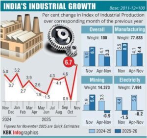 India’s Index of Industrial Production (IIP) rose sharply to 6.7% in November, marking a two-year high, driven by strong manufacturing and mining recovery, even as electricity generation continued to remain weak. This growth comes amid ongoing efforts to balance industrial development with environmental concerns, including the need for environmental clearances and adherence to pollution control norms.