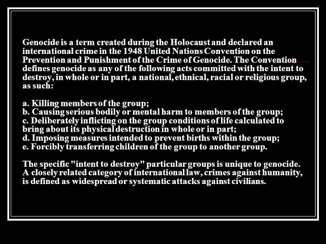 • Genocide was defined under the 1948 UN Genocide Convention as acts with intent to destroy a national, ethnic, racial, or religious group, or a broader group based on certain characteristics.