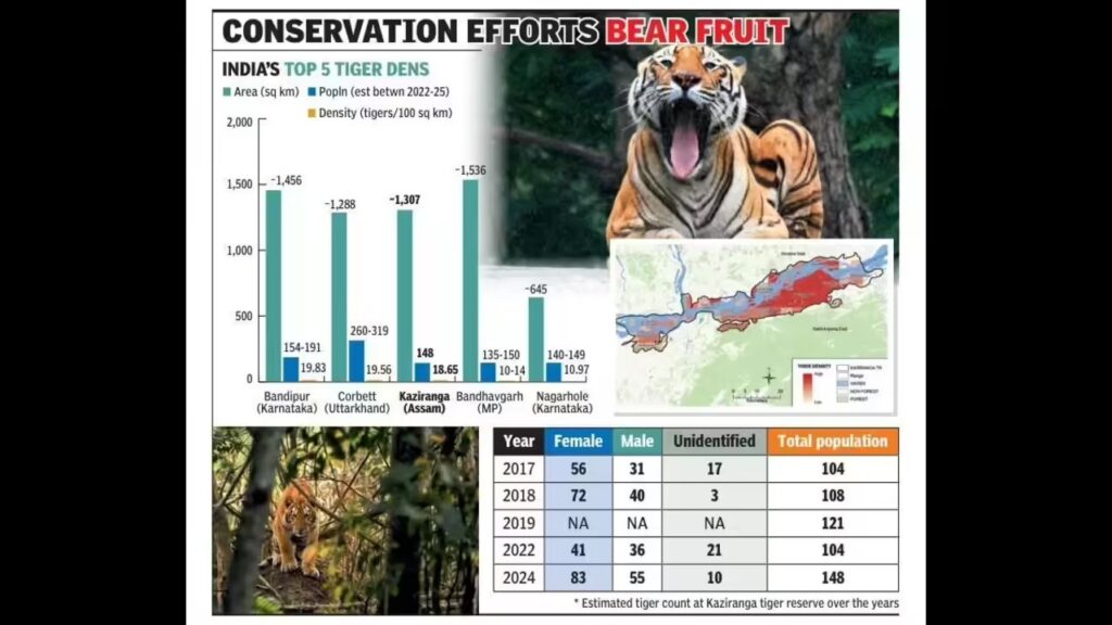 ● The 2024 report revealed 148 tigers in Kaziranga’s 1,307.49 sq. km area, showcasing the reserve’s role in protecting this iconic species.