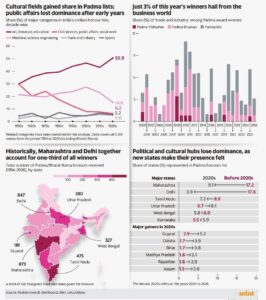 - Business Decline: Trade and industry category remains marginal, with only four awardees, despite India’s expanding entrepreneurial ecosystem post-liberalisation.