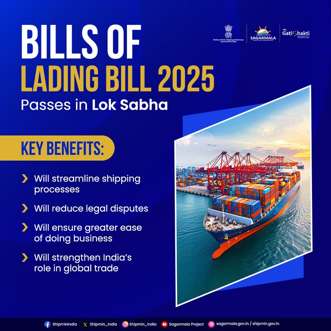 The Parliament has passed the Bills of Lading Bill 2025, aiming to replace the colonial-era 1856 Act and modernize the legal framework for shipping documents. The Bill aligns with the Sagarmala programme and India’s maritime development vision for 2047.