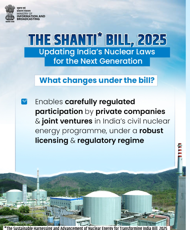 • The Sustainable Harnessing and Advancement of Nuclear Energy for Transforming India (SHANTI) Bill, 2025) merges key provisions from: